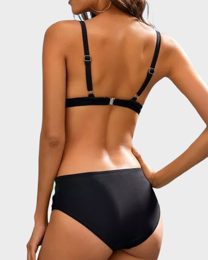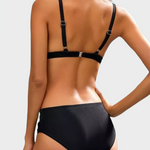 Este biquíni combina estilo e conforto, sem aros que apertam. O decote em V e os blocos de cor acentuam suas curvas de forma elegante, enquanto os bojos sem aro oferecem sustentação suave. A parte de baixo com cintura levemente mais alta cobre e valoriza a barriga de maneira sutil. Perfeito para mulheres que querem se sentir sensuais e confiantes ao mesmo tempo.