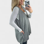 Elegante e quente, este colete é adorado pelos nossos clientes! Este colete fluido e felpudo é perfeito para sobreposição, com seu comprimento longo e corte em A que cria uma silhueta lisonjeira. O material tipo suéter leve oferece calor sem pesar, enquanto a cor mesclada e os detalhes em ribana acrescentam um toque de estilo.
