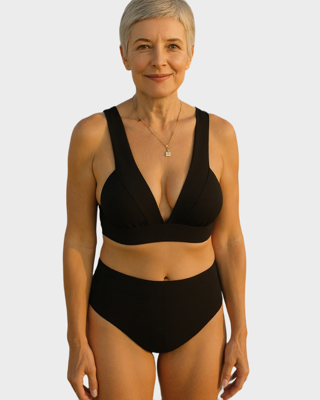 Este biquíni combina elegância atemporal com suporte suave e sem fio e cintura alta que disfarça delicadamente a barriga. Seu design clássico se adapta a qualquer silhueta e garante um ajuste confortável sem apertar. Disponível em cores modernas, você sempre encontrará a combinação perfeita. Ideal para mulheres que querem se sentir confiantes e estilosas na praia ou na piscina.