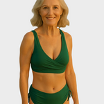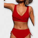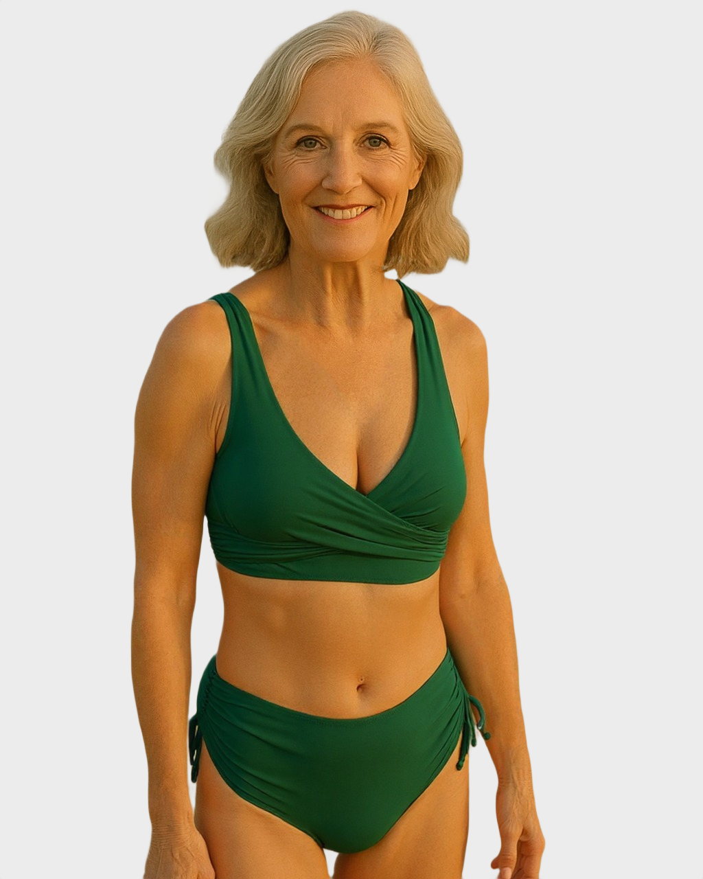 Este biquíni foi criado para mulheres que querem se sentir femininas e confortáveis. A cintura alta e o efeito de pregas disfarçam suavemente a barriga e a cintura. O top oferece suporte sem apertar e valoriza sutilmente o decote. Perfeito para quem busca confiança sem abrir mão de estilo.