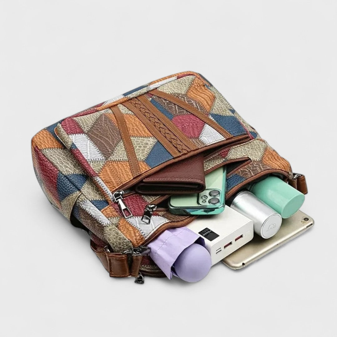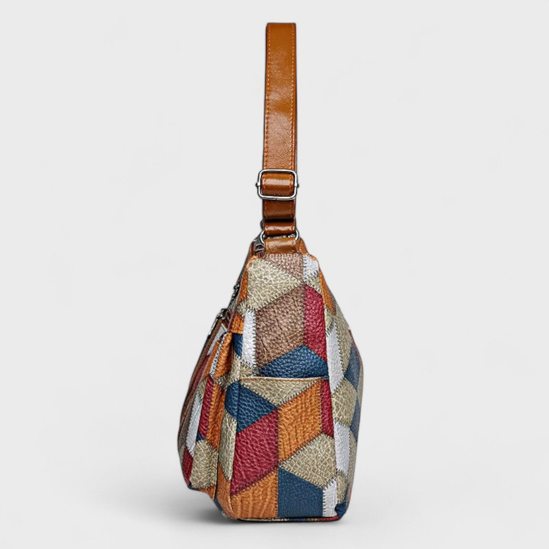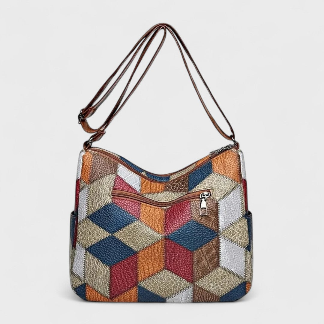 Com o seu rico patchwork geométrico, os elegantes detalhes em pele e os amplos compartimentos, esta bolsa combina estilo refinado e funcionalidade prática, permitindo guardar facilmente todos os itens essenciais do dia a dia.